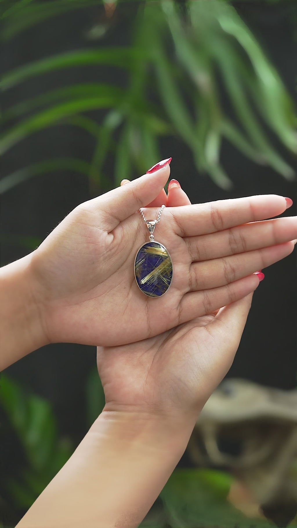 A beautiful blend with golden rutile drifting through deep blue, this Lapis Lazuli Rutile Doublet pendant showcases a rare 42.4 ct oval cabochon (32 × 22 mm). Set in 925 Sterling Silver with a classic bezel, the stone is adorned with golden needle-like rutile inclusions that create a mesmerizing, natural pattern within the deep celestial blue.