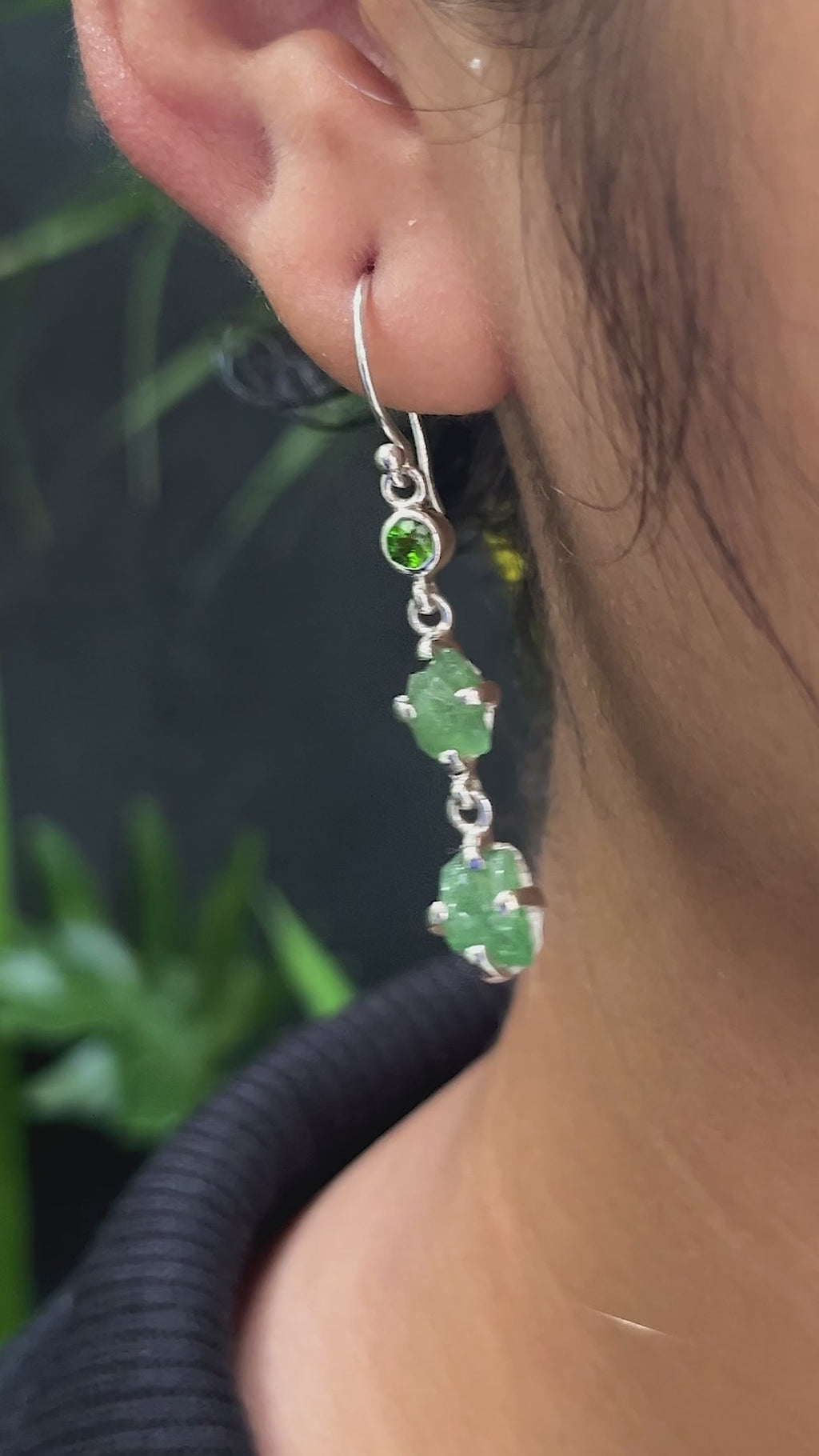 Glowing with vibrant natural richness, these dangle earrings pair rare Tsavorite rough with bright Chrome Diopside accents in refined 925 Sterling Silver. Their graceful three-stone arrangement creates a beautifully pretty silhouette, making this pair a truly uncommon and one-of-a-kind design.