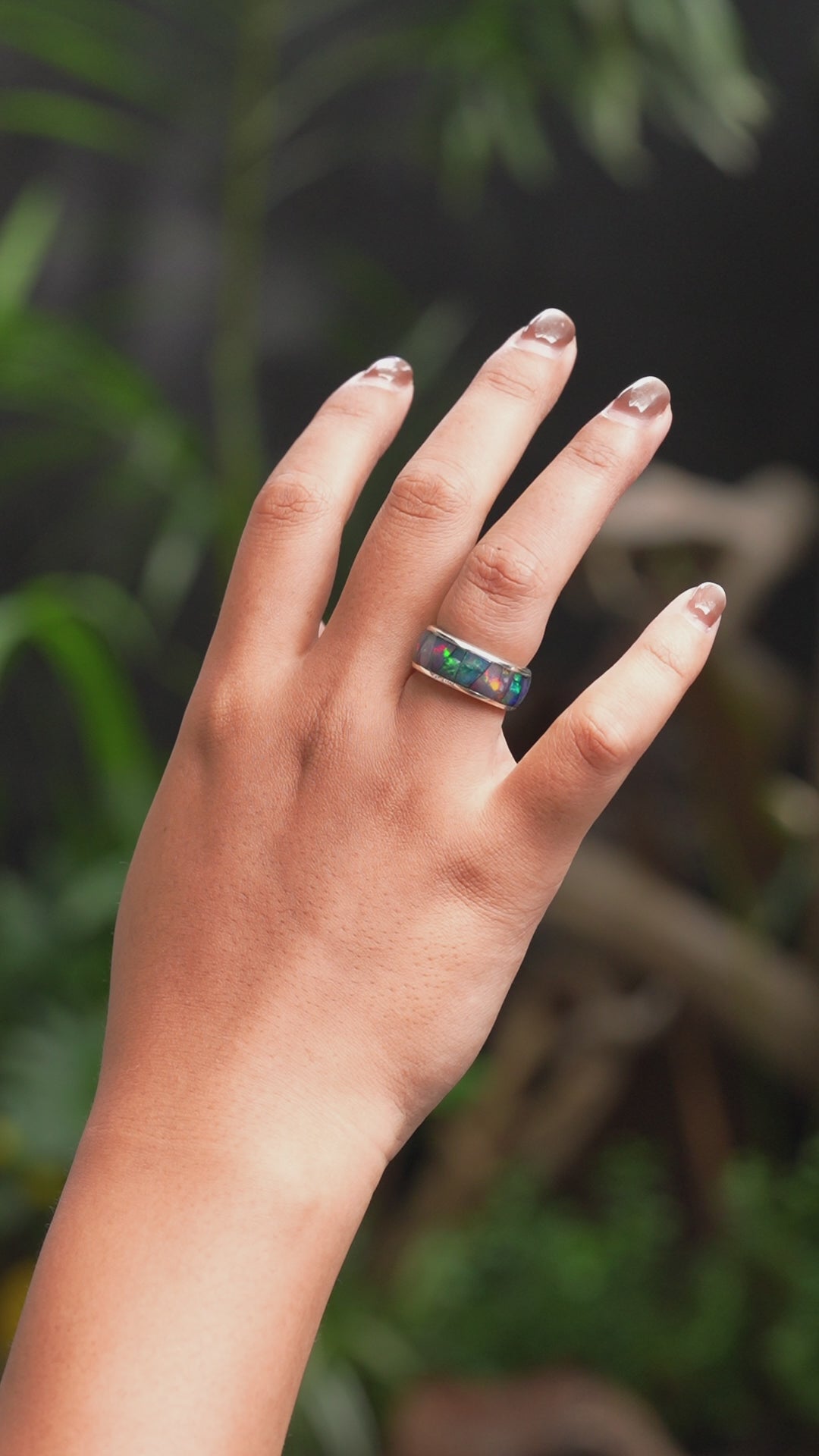 - Exuding refined elegance, this Tungsten-style Ring features a natural Ethiopian Opal delicately hand-inlaid in a mesmerizing mosaic pattern, alive with flashes of green, blue, red, and gold. The 9mm wide Sterling Silver band offers modern strength wrapped in a flawlessly polished, luxurious finish.