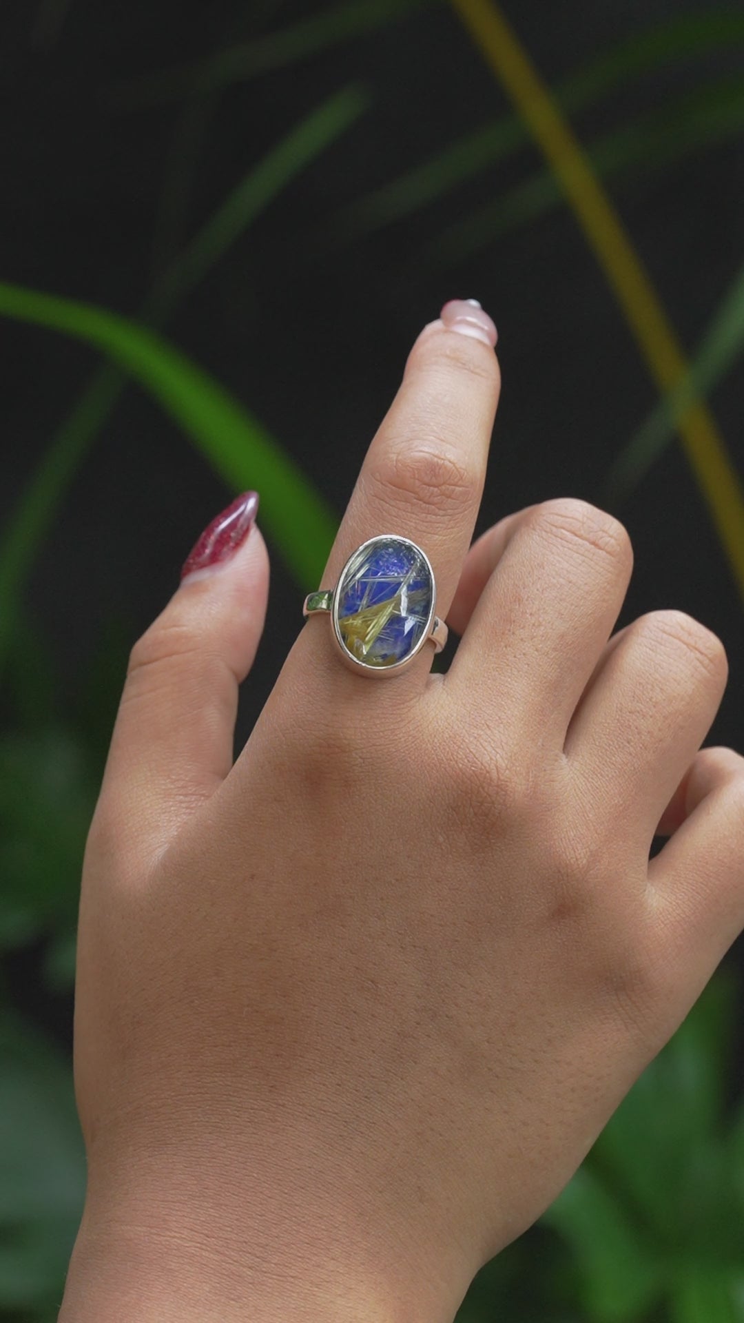 Timeless in design, this Oval Lapis Lazuli Rutile Doublet Ring in Sterling Silver centers on a richly saturated blue stone accented with natural Rutile inclusions that shimmer like fine golden threads. The layered doublet construction enhances depth and contrast, creating a captivating focal point with refined elegance.