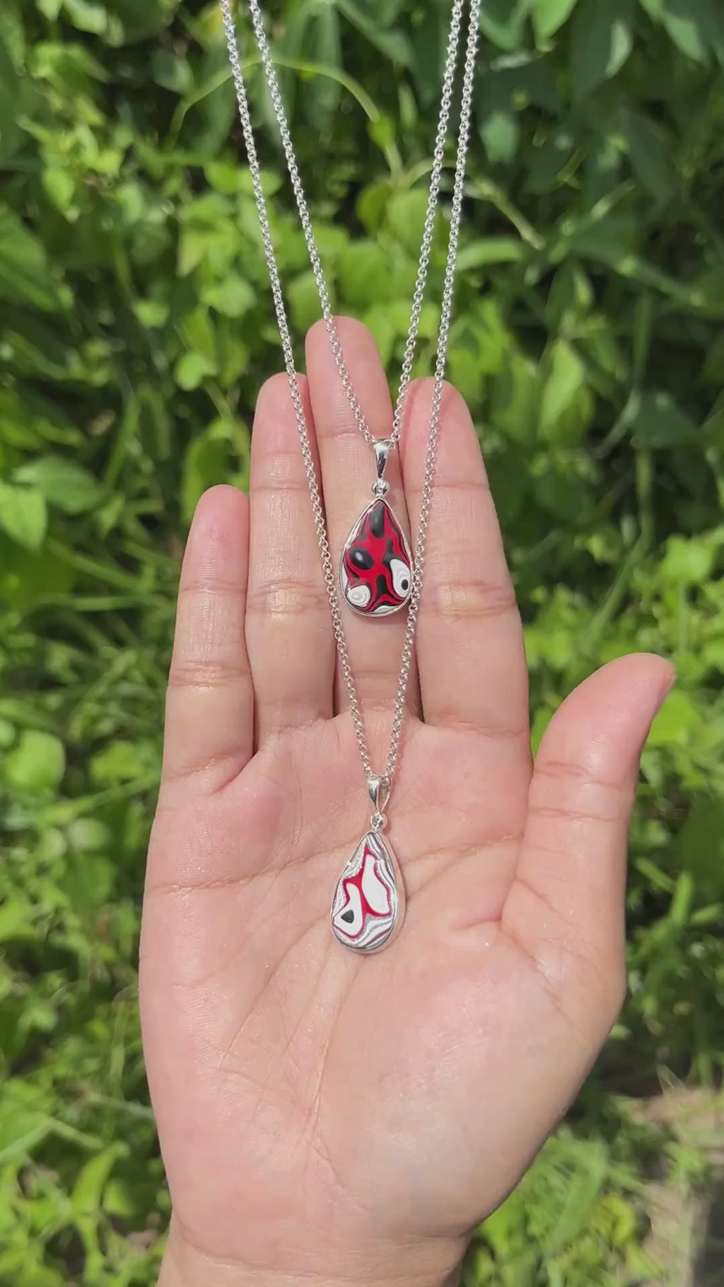 - Red, Black and White Fordite pendant handcrafted in Fine Sterling Silver with intricate filigree back detailing. Available in two sizes, ranging form 1.25" - 1.45" in length, including the bale.