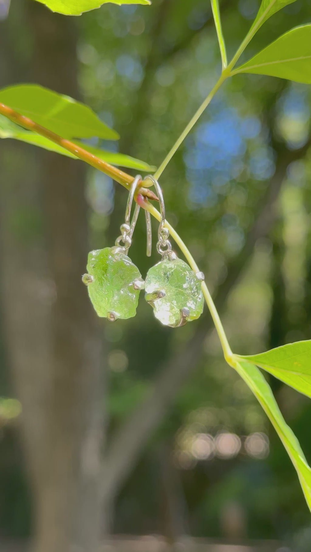 Celebrate the natural beauty of these one-of-a-kind Starborn Rough Green Tourmaline Dangle Earrings. Each earring features a genuine rough Green Tourmaline stone, showcasing its raw, earthy charm and rich verdant hues. The organic shapes and textures make every pair truly unique.