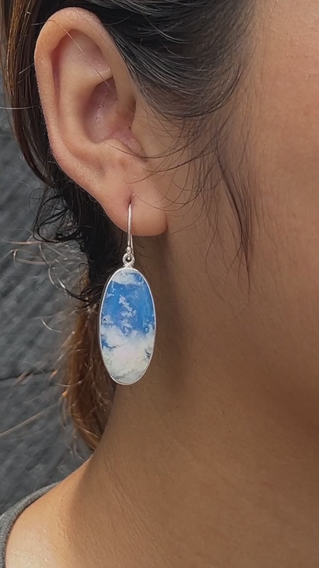 • These elegant earrings feature 20x15mm Sky Plume Agate cabochons, each uniquely showcasing soft sky-blue hues with delicate plume-like inclusions, reminiscent of clouds suspended in crystal. Set in fine 925 Sterling Silver bezels with classic ear hooks, every detail highlights the natural beauty and distinctive patterning of these rare gemstones.