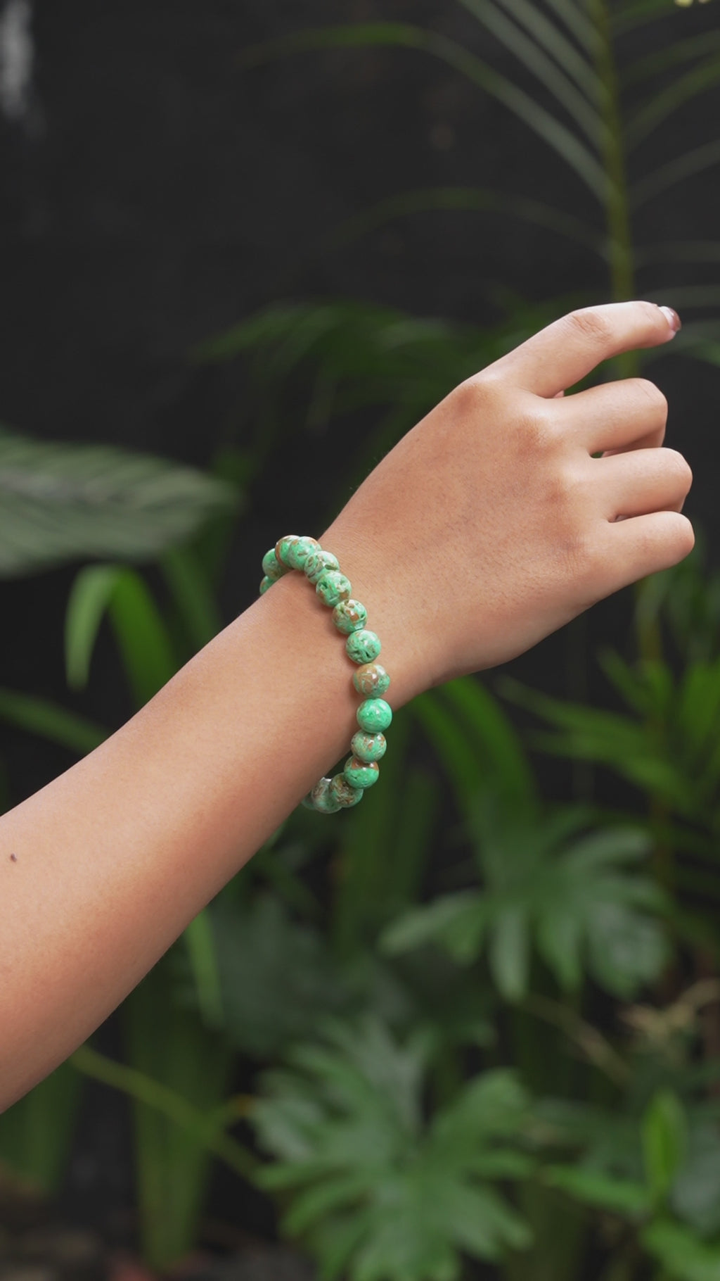 - Rich and earthy, this handmade Smithsonite bracelet showcases vibrant green beads with warm brown patterns. Strung on high-grade elastic for comfort and crafted without metal for skin-friendly wear. Unisex and one-of-a-kind, available in many different sizes. Colors and patterns may vary slightly from the images shown, making each bracelet unique.