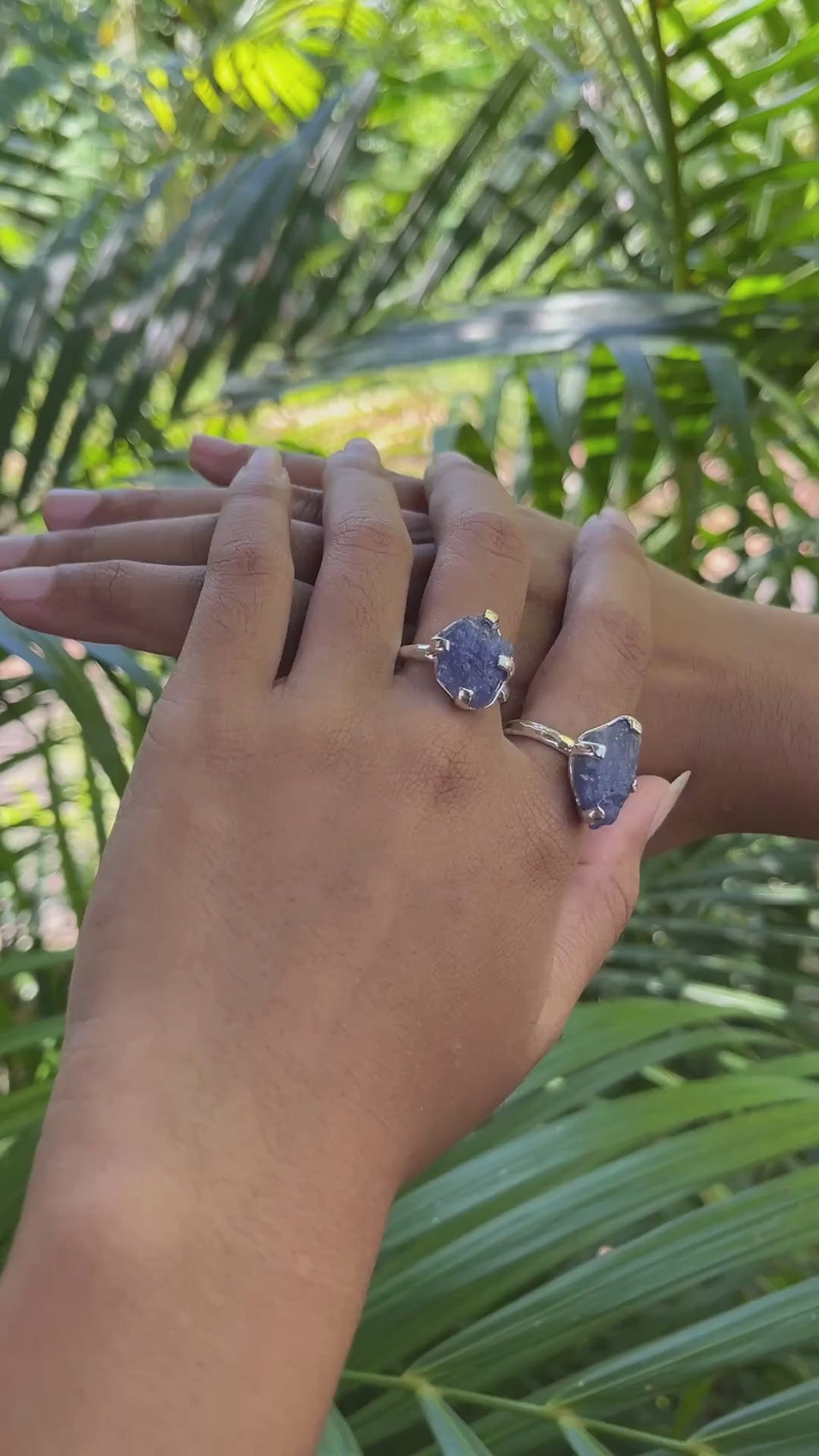 - Natural rough Tanzanite, set in a classic prong style, measures approximately 0.65 to 0.75 inch tall including the setting. Paired with a hammered Sterling Silver shank, this ring blends natural beauty with handcrafted texture.
