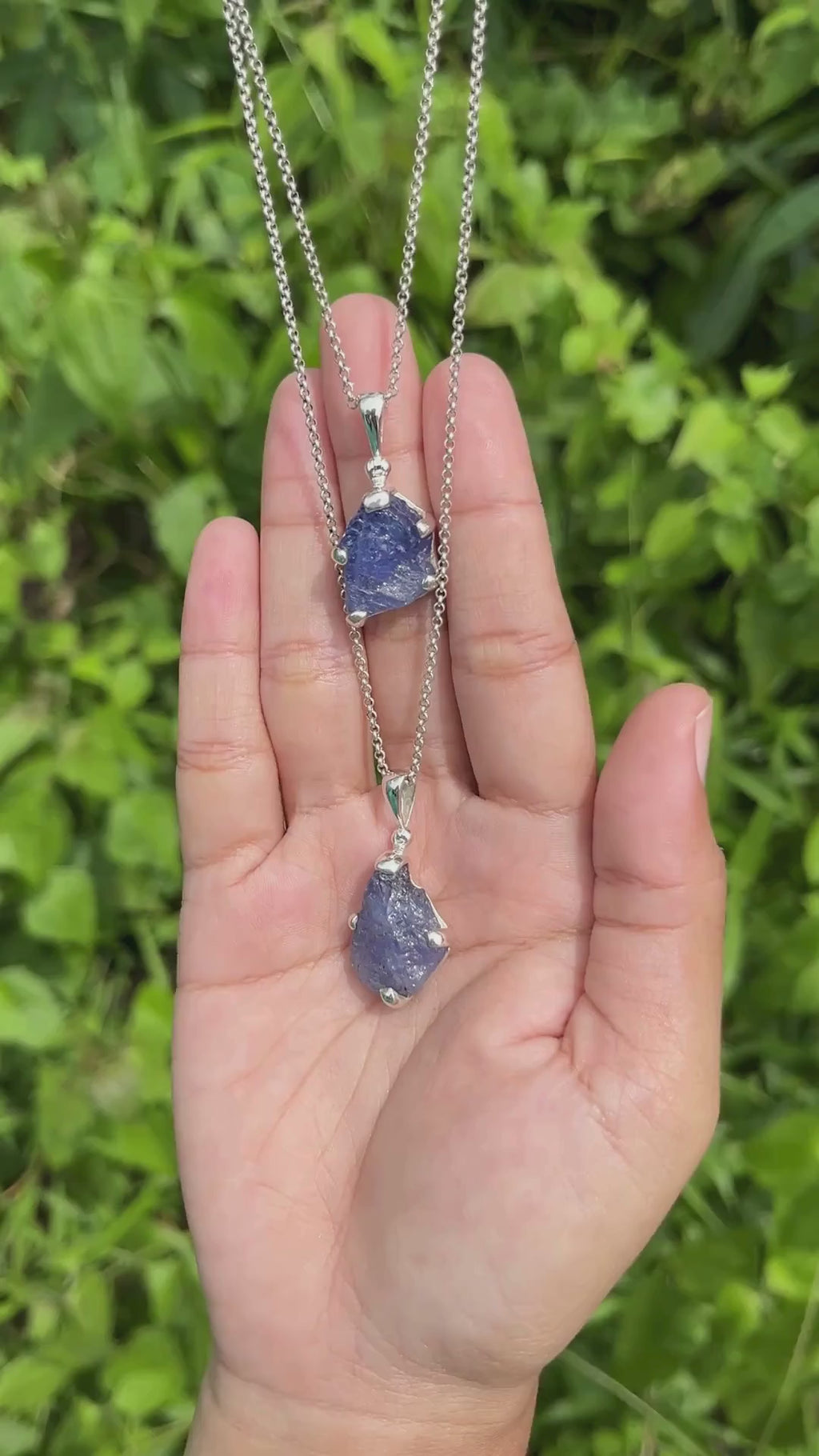 - A rare treasure from a single source on Earth, this raw Tanzanite crystal pendant glows with natural violet-blue charm. Hand-set in a bold prong design of fine Sterling Silver, each piece reveals untamed beauty and individual character. Available in three sizes to suit your style.
