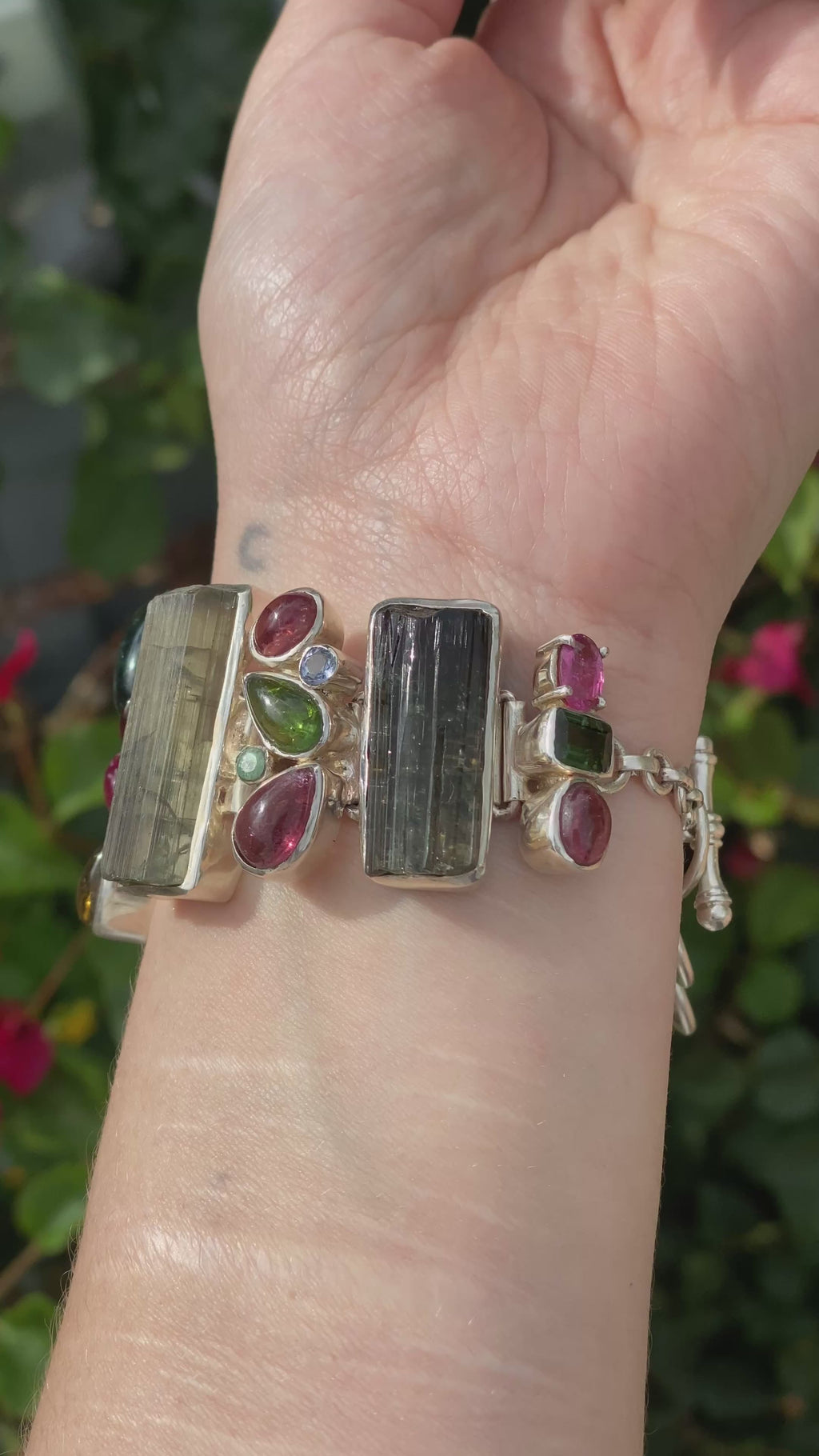 - Handcrafted in 925 Sterling Silver, this one-of-a-kind statement bracelet showcases five natural Green Tourmaline crystals accented by an exquisite array of faceted and cabochon Tourmalines in shades of pink, green, blue, and purple. Each gem is carefully chosen for its natural beauty and vibrant color play, creating a striking spectrum across the wrist.