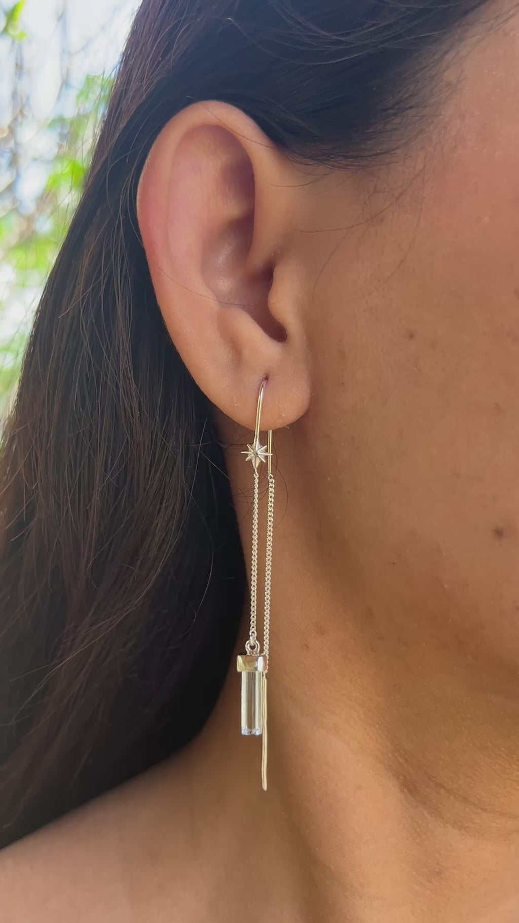 - A tribute to serene elegance and expert craftsmanship, these handcrafted threader earrings feature 14–16mm Aquamarine Crystals set in Sterling Silver caps, accented by a radiant supernova star. With a total length of 2.4–2.5 inches and chains measuring 1.15" in front and 1.4" in back, they embody a cool, celestial glow in a uniquely balanced design.